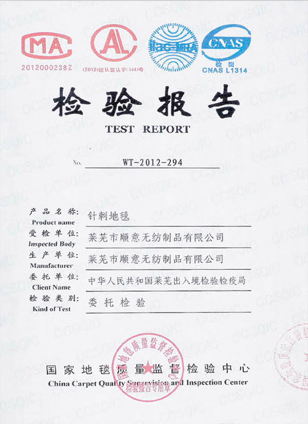 • 本公司生產的無紡阻燃地毯檢測合格